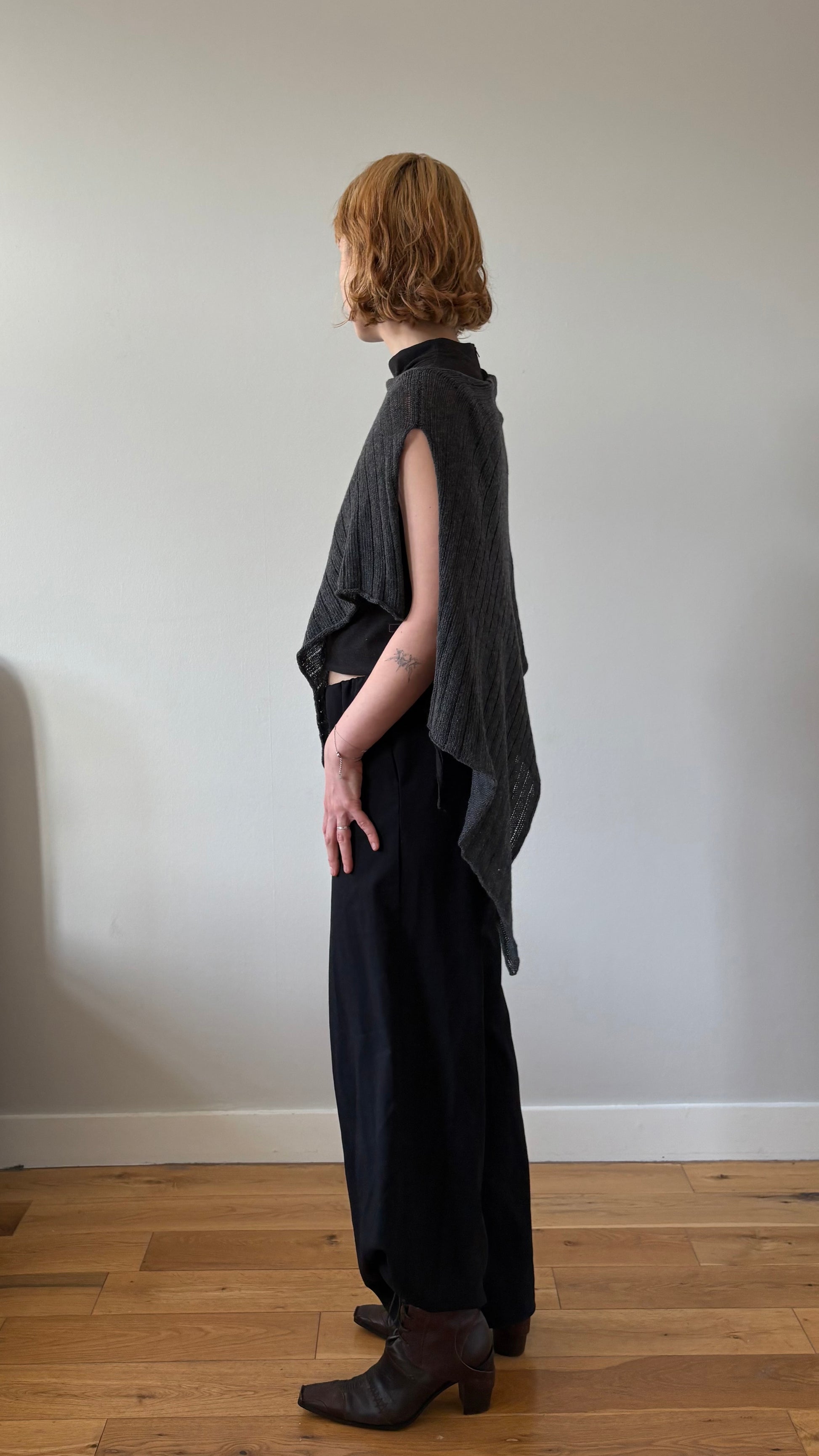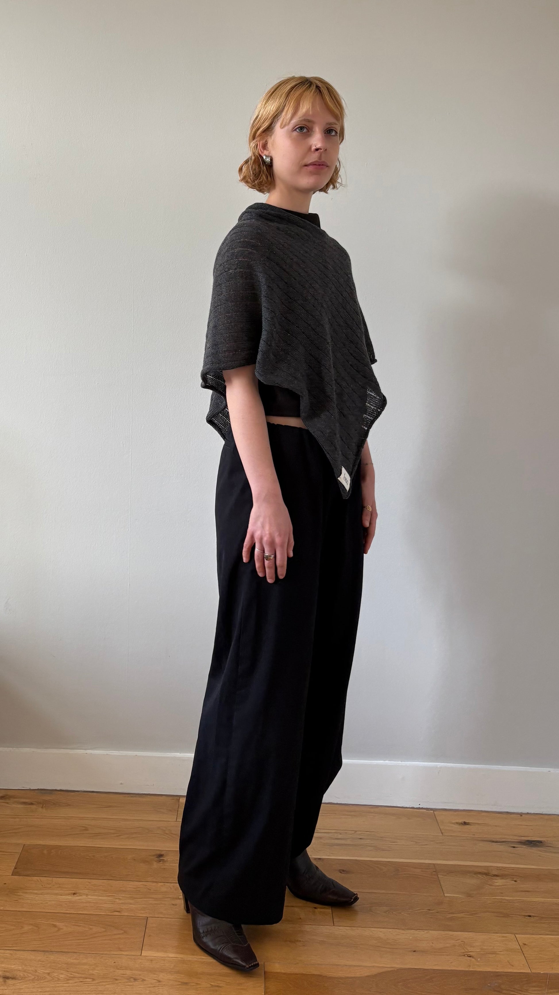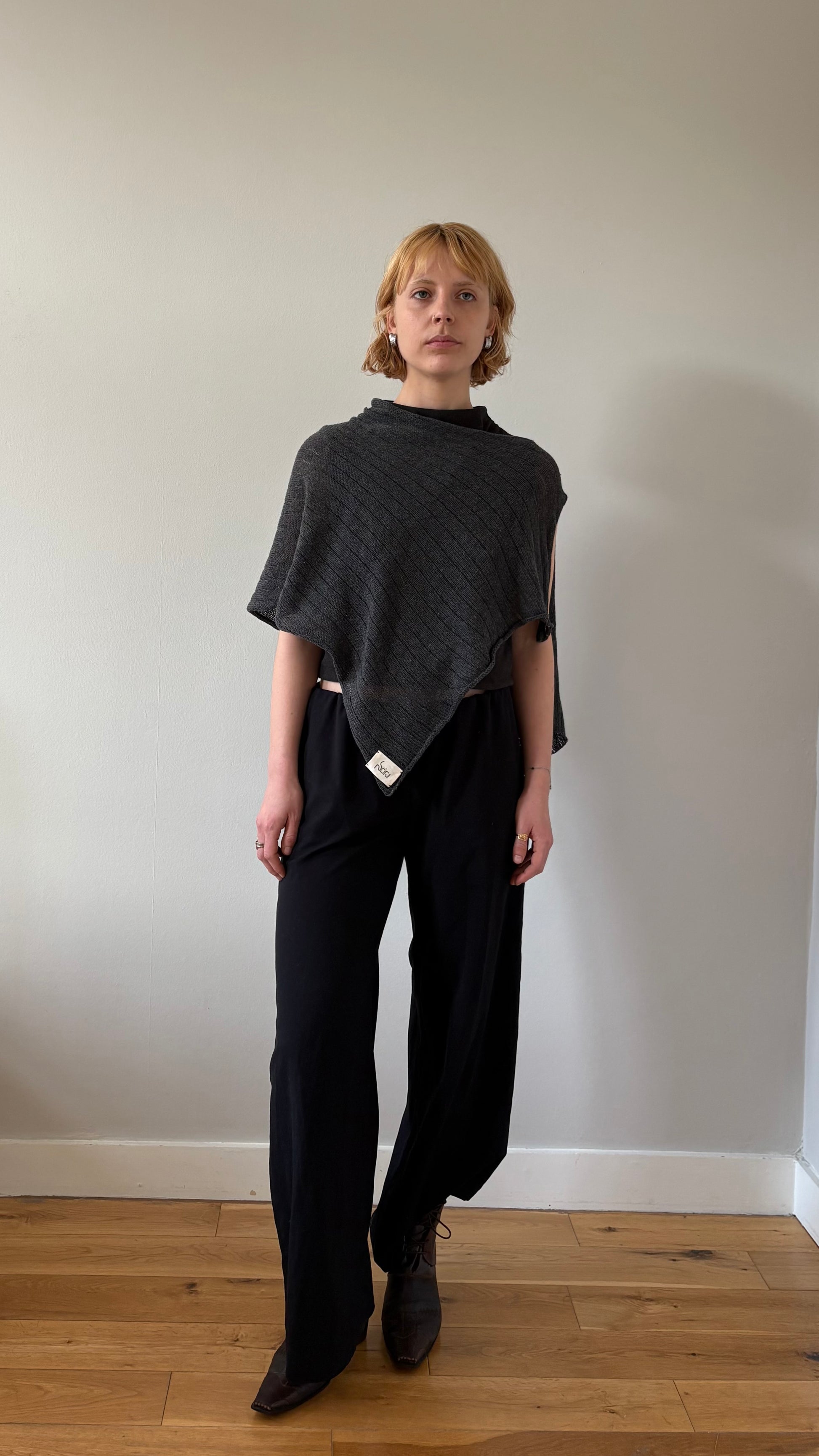The veig shawl is a limited edition asymmetrical piece, with only 10 in existence. Designed for modern ease, its smaller, one-shoulder silhouette offers a minimalist yet striking layer—perfect for adding sculptural interest to your daily look.